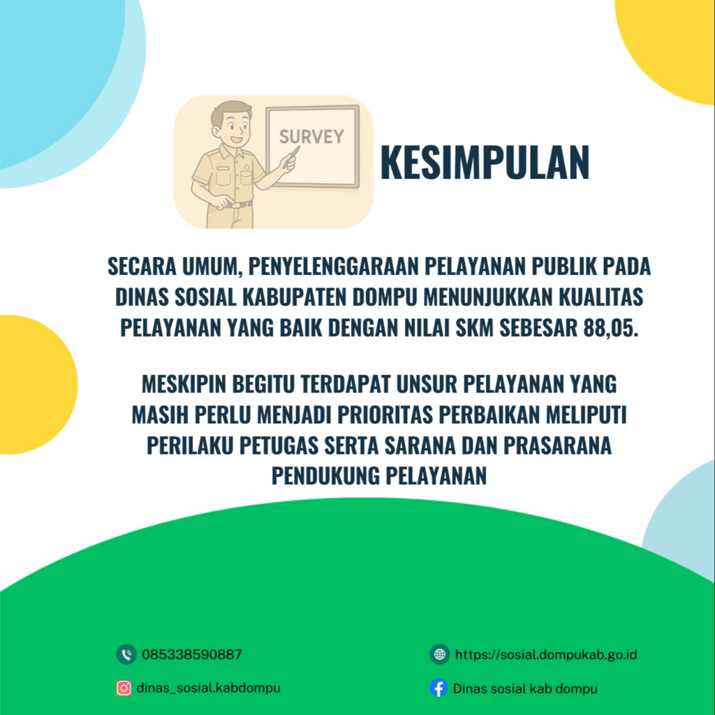 Melalui hasil survei ini, Dinas Sosial Kabupaten Dompu berkomitmen untuk terus meningkatkan kualitas pelayanan publik, melakukan perbaikan terhadap unsur-unsur prioritas, serta memberikan pelayanan yang lebih cepat, tepat, transparan, dan akuntabel.