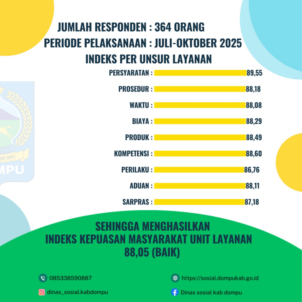 Berdasarkan hasil pengolahan data yang telah dilakukan, diperoleh nilai Indeks Kepuasan Masyarakat sebesar 88,05. Nilai tersebut termasuk dalam kategori BAIK, yang menunjukkan bahwa kinerja pelayanan publik di lingkungan Dinas Sosial Kabupaten Dompu telah memenuhi standar kualitas yang diharapkan masyarakat.